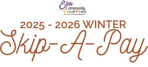 DURING THE MONTHS OF NOVEMBER, DECEMBER, & JANUARY, YOU MAY CHOOSE ONE MONTH TO SKIP-A-PAYMENT WITHOUT PENALTY. THIS OFFER APPLIES TO EACH LOAN YOU HAVE WITH ELITE COMMUNITY CREDIT UNION EXCEPT CASH-N-DASH LOANS, VISA, AND HOME EQUITY LOANS. TO QUALIFY, ALL LOANS MUST BE CURRENT AND NO OVERDRAWN SAVINGS OR CHECKING ACCOUNTS. OTHER RESTRICTIONS MAY APPLY. CLICK FOR ADDITIONAL DETAILS.